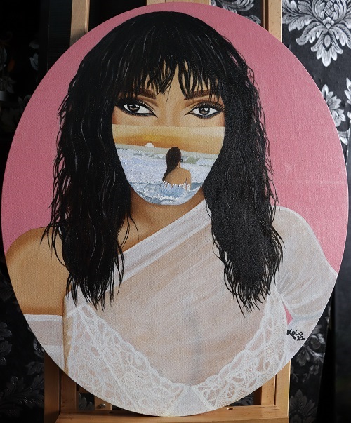 SHARE →This poignant portrait of Samantha tells a powerful story of resilience and transformation. Her face is obscured by a mask, within which a haunting image of a woman adrift in the ocean emerges. Inspired by the true story of my best friend, who faced unimaginable trials. Abandoned and left to drown in the depths of emotional, mental, and physical abuse. But she did not sink. Instead, she swam, transforming from a drowning girl into a mermaid, symbolizing her strength and dominance over the challenges that sought to consume her. All KoCo's masterpieces/commissioned artworks come professionally and beautifully packaged with a Certificate of Authenticity, care/handling card, and invoice. Each pi ... This poignant portrait of Samantha tells a powerful story of resilience and transformation. Her face is obscured by a mask, within which a haunting image of a woman adrift in the ocean emerges. Inspir ...