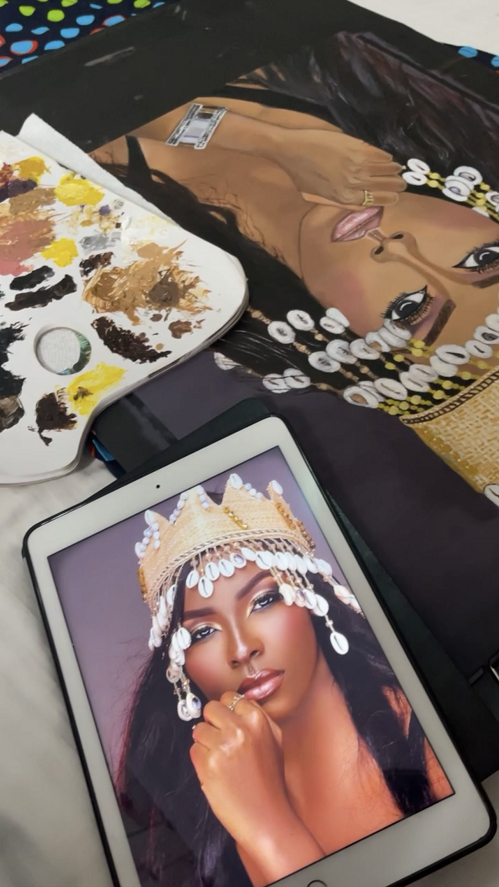 COLLECTIn "Black Allure," I sought to capture the essence of true African royalty. The inspiration came from Michele-Ange Minkata, a Cameroonian Beauty Queen whose presence is a celebration of Africanness in its purest form. Her rich, brown skin, adorned with a crown of cowries, speaks of heritage and power, while her talent as a musician—strumming the guitar and crafting songs—adds depth to her beauty. This painting is more than an image; it is an ode to the lushness of her spirit, the allure of her culture, and the pride she carries as she represents her nation on the global stage. Through this piece, I wanted to honor not just her striking appearance, but the soulful melody that resonates fr ... In "Black Allure," I sought to capture the essence of true African royalty. The inspiration came from Michele-Ange Minkata, a Cameroonian Beauty Queen whose presence is a celebration of Africanness in ...